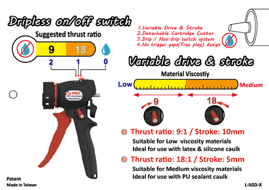 Variable trust ratio (9:1&18:1) / detachable cartridge cutter/ 400ML/ 3-stage drip/non-drip system